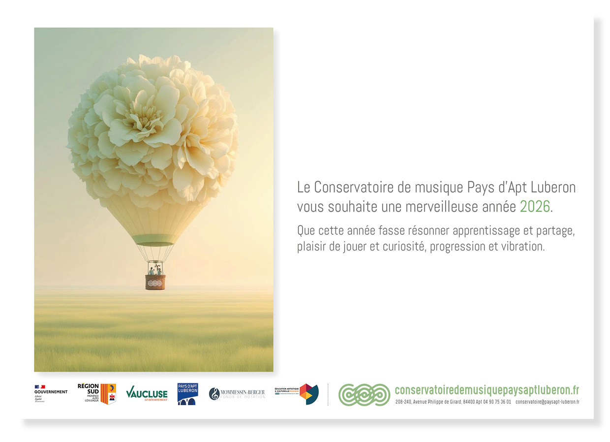 Julie ROUCHON, Directrice du Conservatoire de Musique Pays d’Apt Luberon, ainsi que l’ensemble de l’équipe pédagogique, administrative et technique, vous souhaitent une très belle rentrée musicale 2025/2026.Nous vous attendons nombreuses et nombreux le lundi 15 septembre 2025 pour la reprise de toutes les disciplines individuelles et collectives du Conservatoire.