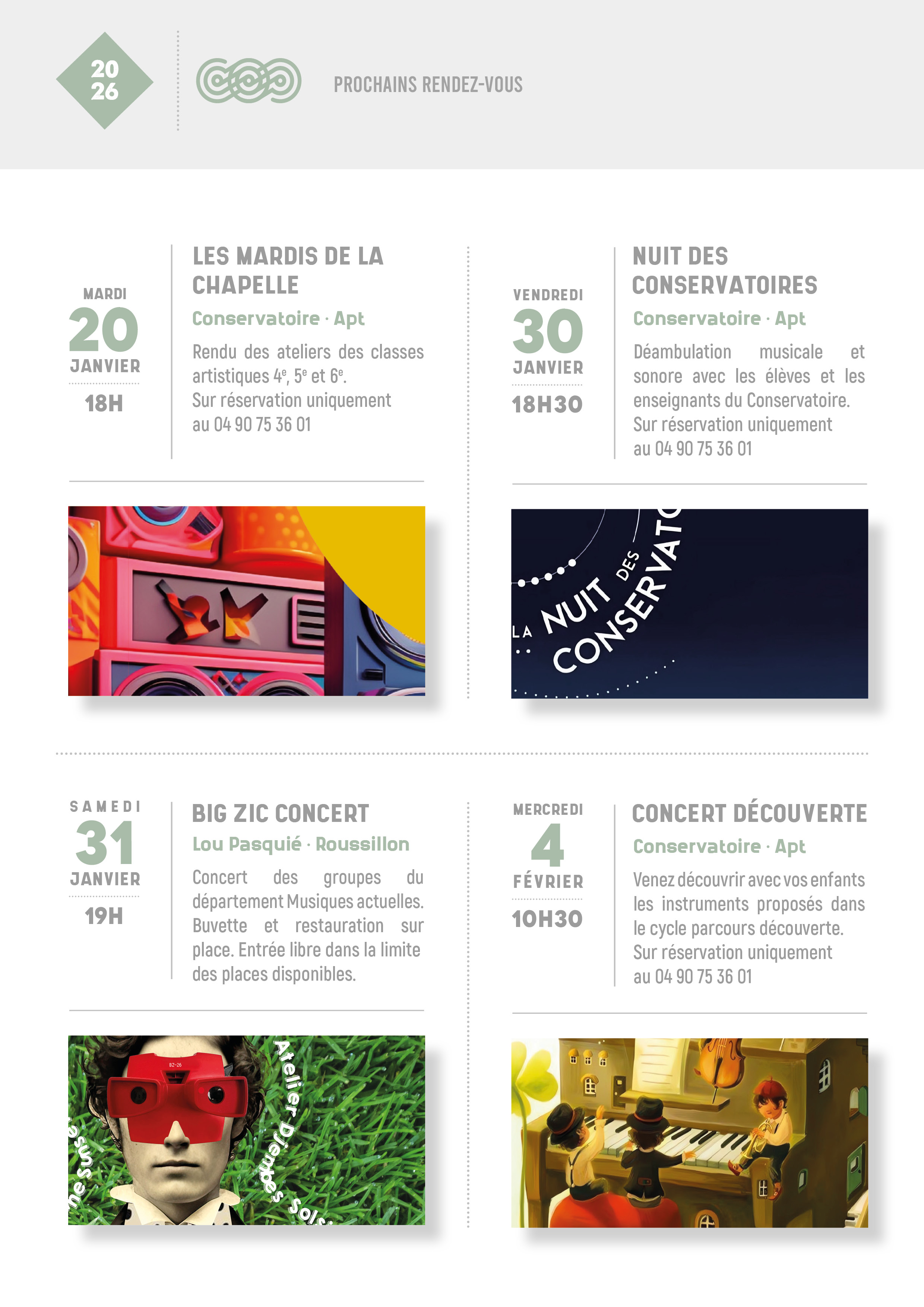 Le Conservatoire reste à votre écoute pour tout renseignement complémentaire au 04.90.75.36.01 ou à conservatoire@paysapt-luberon.fr