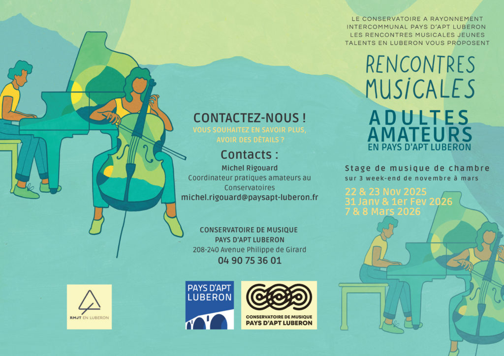 En partenariat avec les Rencontres Musicales Jeunes Talents en Luberon (Saignon), le Conservatoire de Musique Pays d’Apt Luberon vous propose la première édition des RENCONTRES MUSICALES ADULTES AMATEURS EN PAYS D’APT LUBERON.