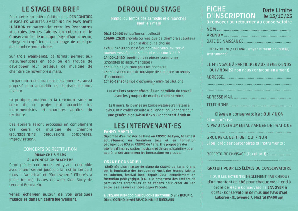 Inscriptions à retourner au plus tard le 15/10/2025 à conservatoire@paysapt-luberon.fr, en complétant le document ci-joint. Renseignements auprès de Michel RIGOUARD – Coordinateur pratiques amateurs du Conservatoire – michel.rigouard@paysapt-luberon.fr En espérant vous rencontrer nombreuses et nombreux pour cette nouvelle proposition ! Julie ROUCHON Directrice du Conservatoire